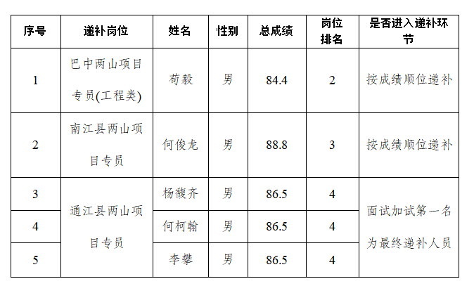 根據《巴中發展控股集團有限公司公開招聘工作人員公告》有關規定,經集團招聘工作領導小組專題會議研究決定,對巴中發展控股集團有限公司2024年公開招聘工作人員體檢環節中出現缺額的崗位按成績進行順位遞補,并對個別崗位考試分數相同的遞補人員進行面試加試。現將有關事項公告如下: